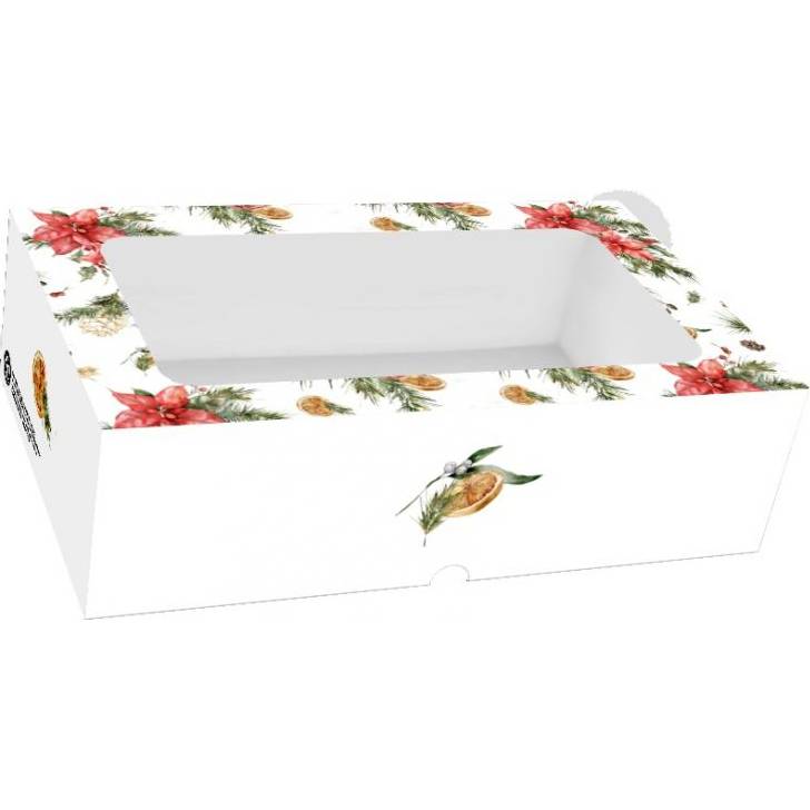 Popis produktu Skladacia krabička na cukríky s okienkom sušený pomaranč a poinsettia 25x15x7cm - Alvarak